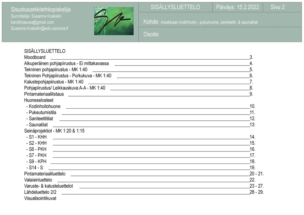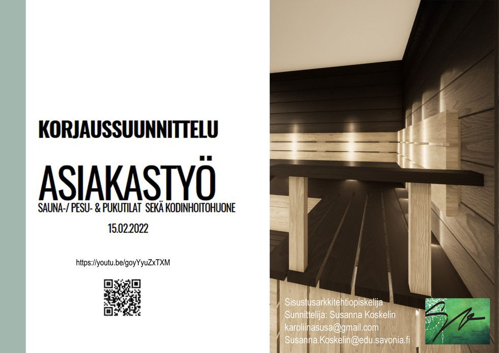Suunnitelmassani purettiin pukuhuoneen sekä suihkutilan väliseinää ja suihkutilan puolella vesipiste lisättiin päätyseinälle ja vanha vesipiste siirrettiin saunan puolelle. Suihkutilaan vanhan vesipisteen kohdalle kiinteä ikkuna sekä saunaovi muutettiin lasioveksi tuomaan luonnonvaloa saunatilaan.